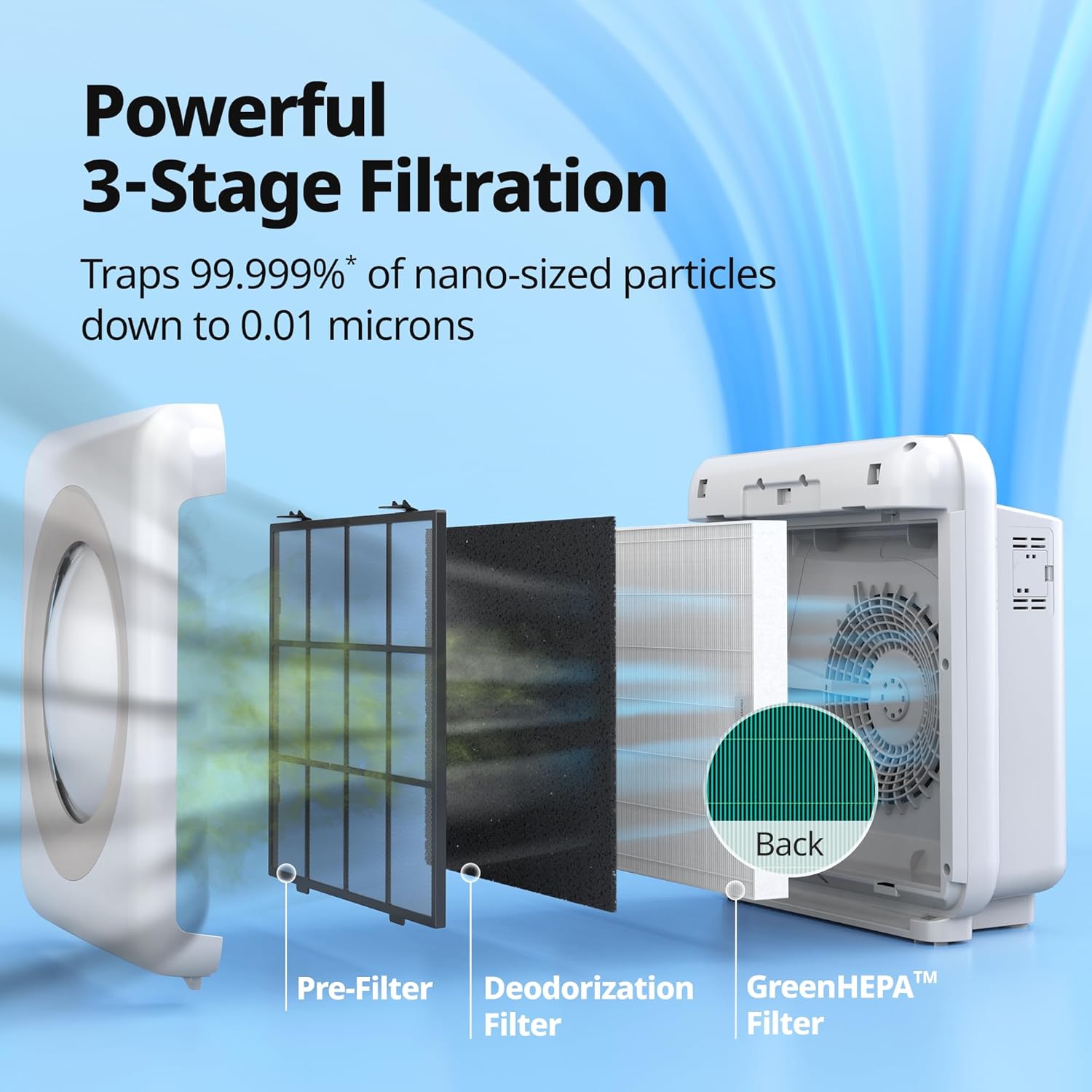 GreenHEPA: The GeenHEPA filter provides double protection by capturing germs and impurities and inactivating them into the theGreenHEPA filter