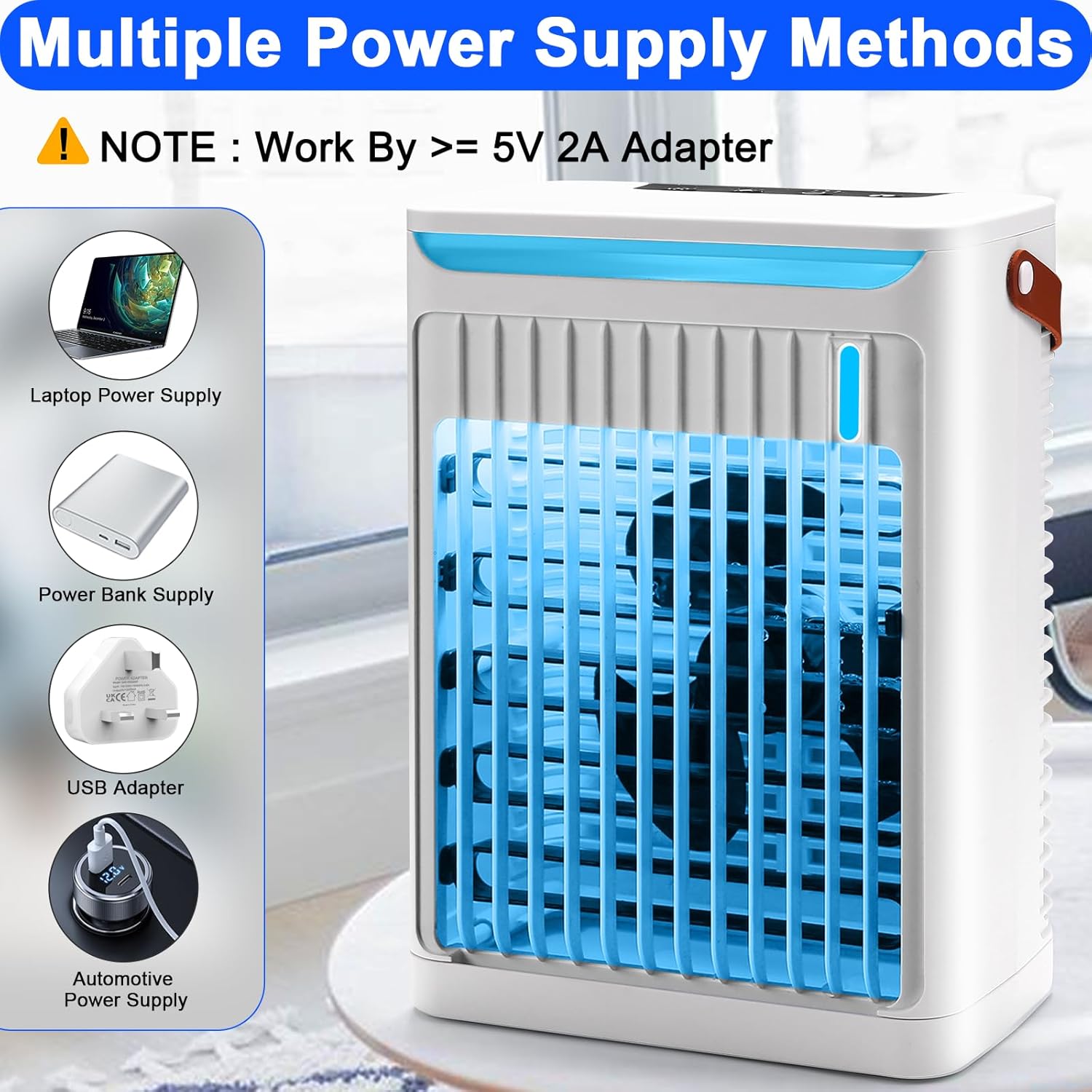 Best used with a USB block in the mains. I tried it with the USB ports on an extension cable and it barely blew air. Plugged in a block and it made a big difference!Really not bad for the price. Not as cold from the chilled water as there are no filter bands for it to blow across (oddly for an air conditioner), so it’s more of a fan and humidifier only.But it cools nicely for a smaller area. It is quite loud though on full.