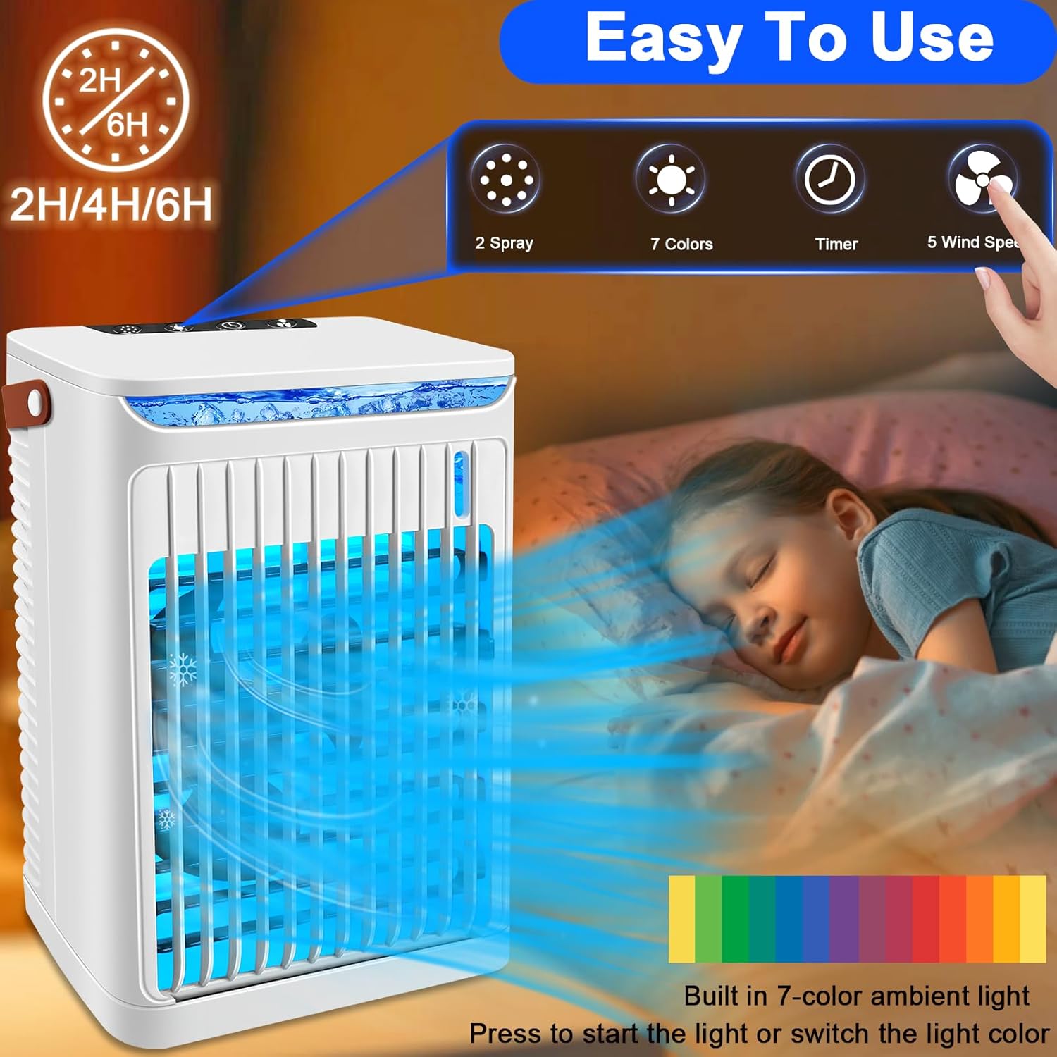 【4 IN 1 Small AC】Multifunctional desktop small air cooler with 4 functions including cooling fan, air conditioners, humidifier,7 colors LED light.The upgraded silent motor has strong wind power and fast cooling, the hot wind is quickly cooled into cold wind in simply add water or ice to the top fill water tank & press the button, It is your best choice in hot summer.*This portable air conditioners fan is for personal use, cannot cool down a small room, please don’t put it too far away from you.